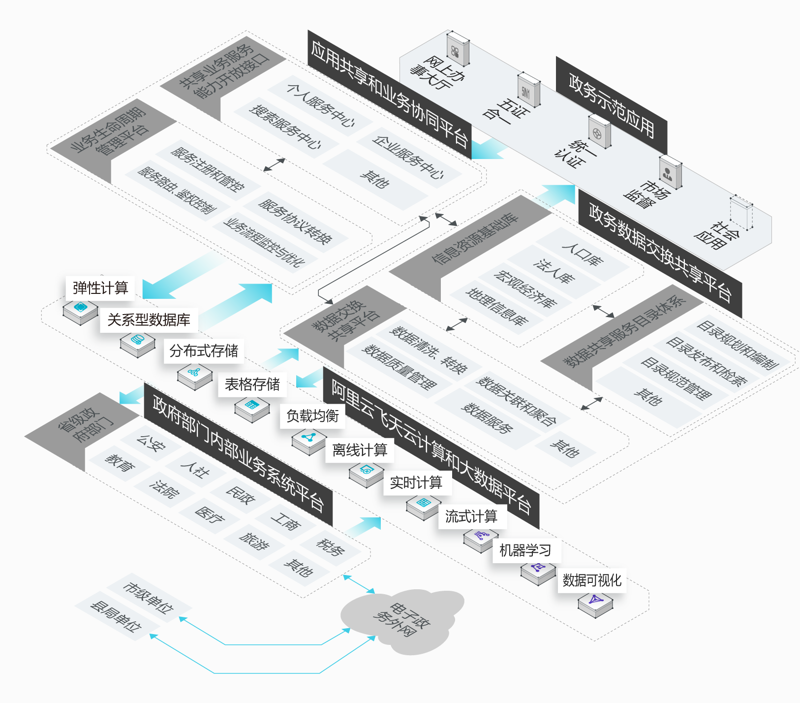 建設(shè)統(tǒng)一的政務(wù)專有云和大數(shù)據(jù)平臺(tái),實(shí)現(xiàn)統(tǒng)一資源池化,平臺(tái)資源池各個(gè)政府部門間共享,最大化利用平臺(tái)資源。