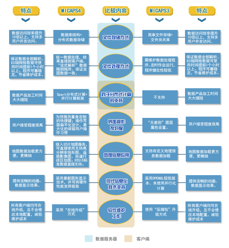 相比前幾代系統,MICAPS4.0第一次使用純數據庫徹底取代傳統的文件系統,進行氣象數據實時存儲。