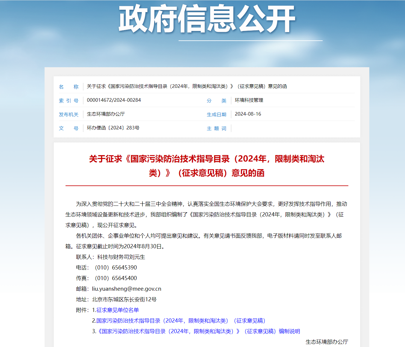 為深入貫徹黨的二十大和二十屆三中全會精神,認真落實全國生態環境保護大會要求,更好發揮技術指導作用,推動生態環境領域設備更新和技術進步,我部組織編制了《國家污染防治技術指導目錄(2024年,限制類和淘汰類)》(征求意見稿),現公開征求意見。
